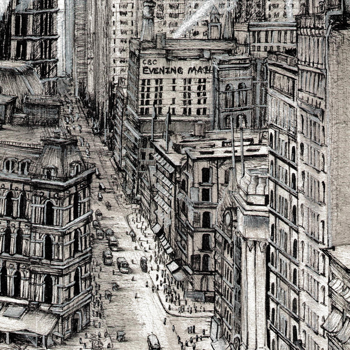 Large drawing of an iconic view of Manhattan in the year 1908.